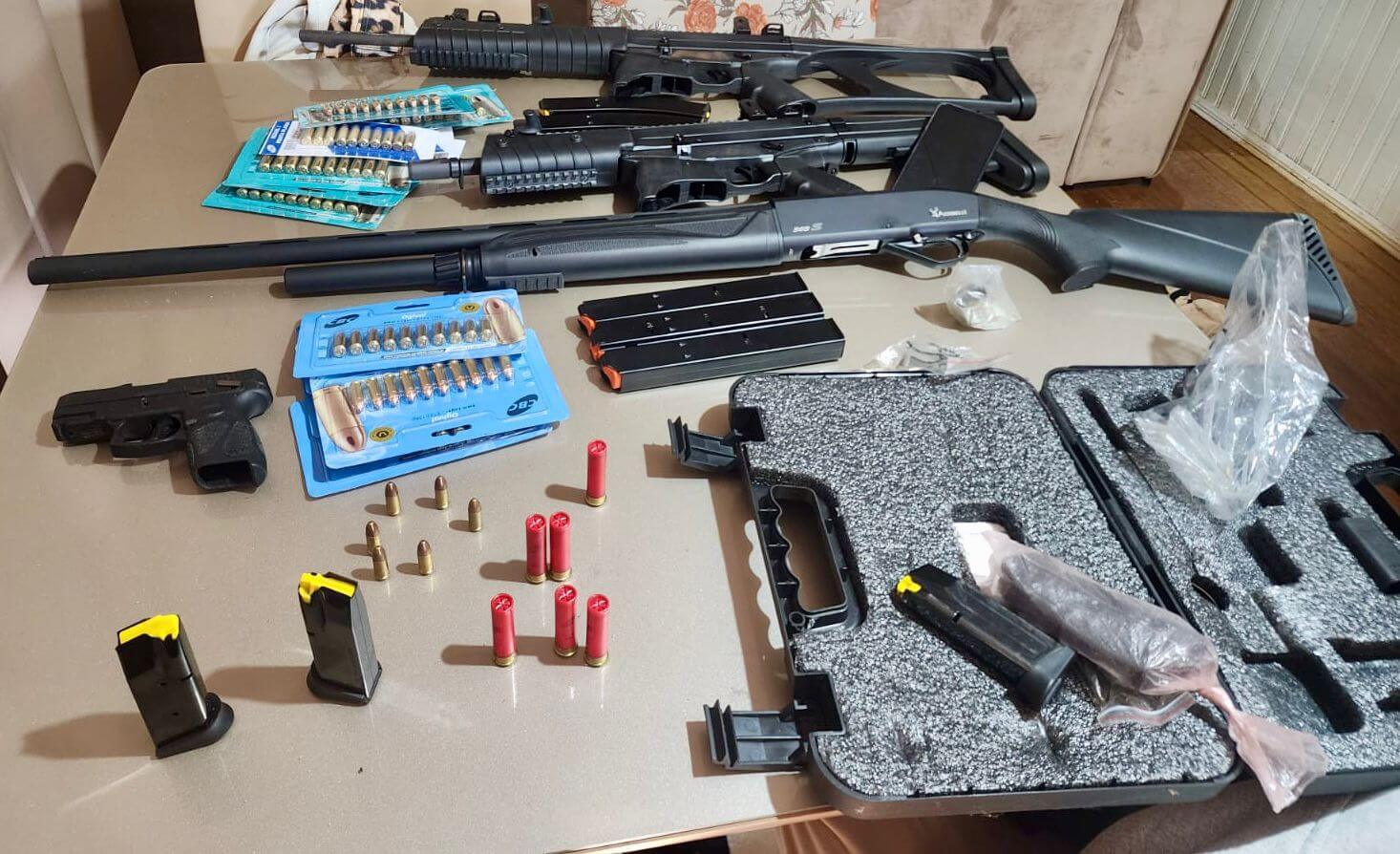 Durante as diligências em Seberi, uma mulher foi presa em flagrante por ocultar armamento de grosso calibre pertencente à organização criminosa. No local, foram apreendidas: uma pistola calibre 9mm, uma carabina calibre .40, uma carabina 9mm, uma espingarda calibre 12 semiautomática, além de carregadores, acessórios e diversas munições.