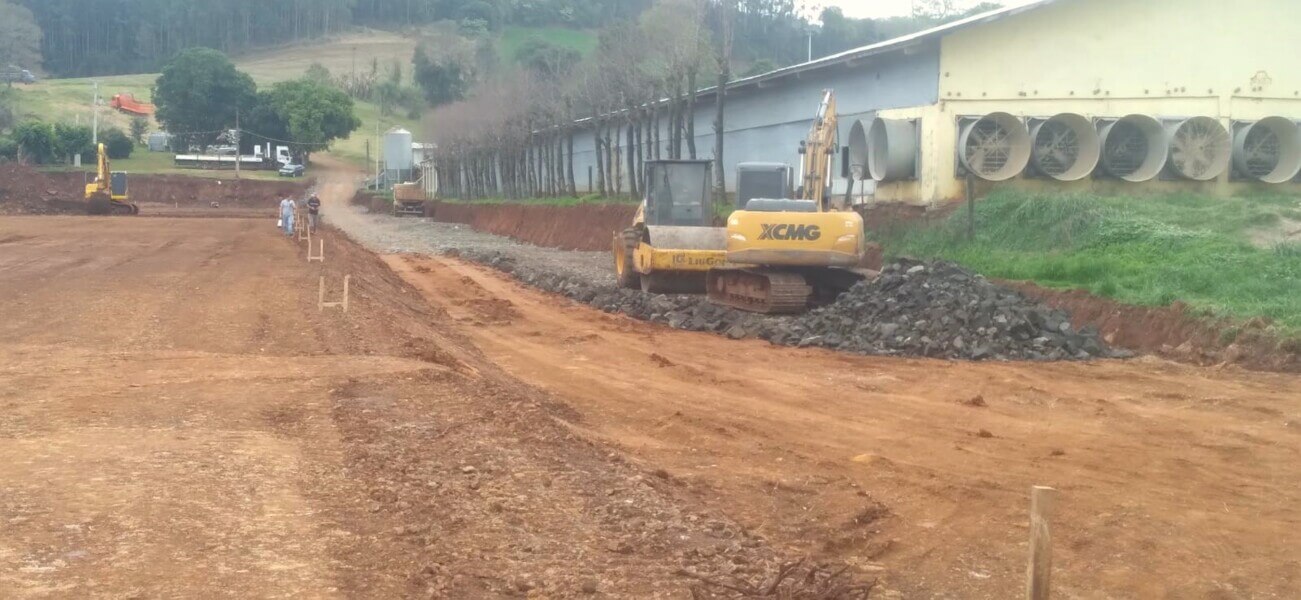 Os trabalhos incluíram o cascalhamento da estrada de acesso e a terraplanagem da área destinada à construção de um novo aviário. Também foram instalados tubos e drenos em pontos estratégicos, garantindo o adequado escoamento da água e melhorando as condições de infraestrutura da propriedade.