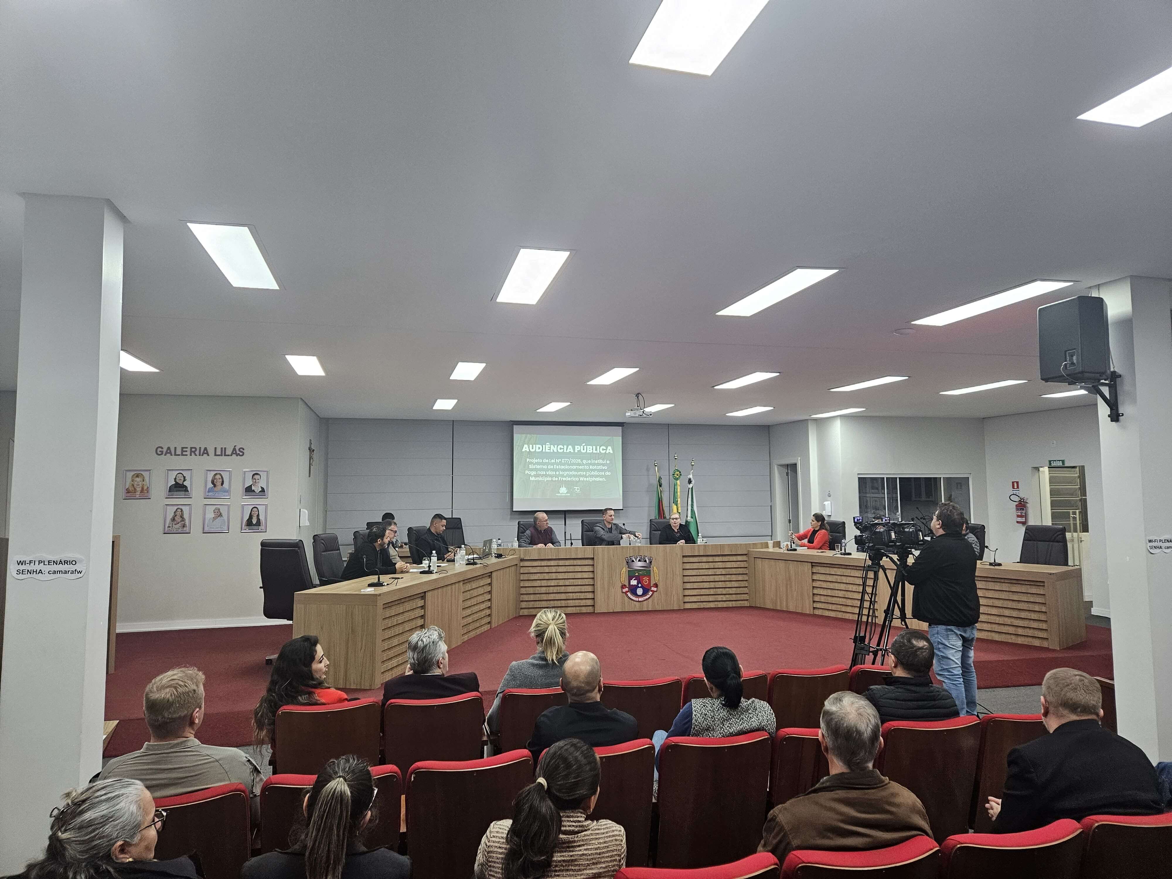 Com o objetivo de debater com a comunidade o projeto que institui o novo Sistema de Estacionamento Rotativo Pago em Frederico Westphalen, foi realizada uma Audiência Pública na Câmara de Vereadores, na quarta-feira, 20. O encontro foi promovido pela Comissão de Desenvolvimento Econômico, Fiscalização e Controle Orçamentário, do Legislativo Municipal, presidida pelo vereador Leandro Mazzutti. Também participaram do debate a presidente da Casa, Marizete Frozzi; o vice-presidente, Ismael Cocco dos Santos e os edis Alessandro Molossi, Belonir Vendruscolo, Lídio Pedro Signori, Rubia Dal Puppo Maas e Fabio Martins da Silva, além de secretários municipais, o presidente da Associação Empresarial ACI/CDL, Alessandro Dal Piva e demais integrantes da diretoria da AEFW, empresários, representantes de entidades e instituições, Brigada Militar e comunidade em geral.