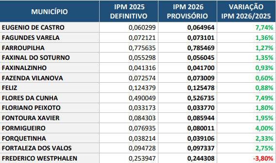 O Índice de Participação dos Municípios (IPM) é o indicador utilizado para a distribuição destes recursos no Estado, determinando a quota-parte de cada uma das 497 cidades gaúchas sobre as receitas do ICMS. A portaria com os números do IPM Provisório para 2026 foi publicada no Diário Oficial do Estado.