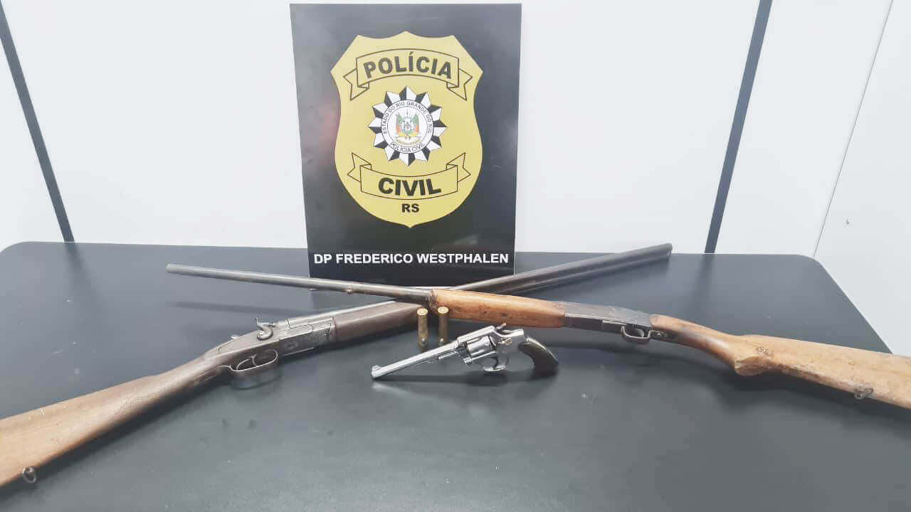 Durante as diligências, os policiais apreenderam três armas de fogo em situação ilegal, duas espingardas e um revólver, todos calibre 32, além de munições. Os responsáveis foram presos em flagrante por posse ilegal de arma de fogo e encaminhados à Delegacia de Polícia, onde foi arbitrada fiança nos dois casos.
