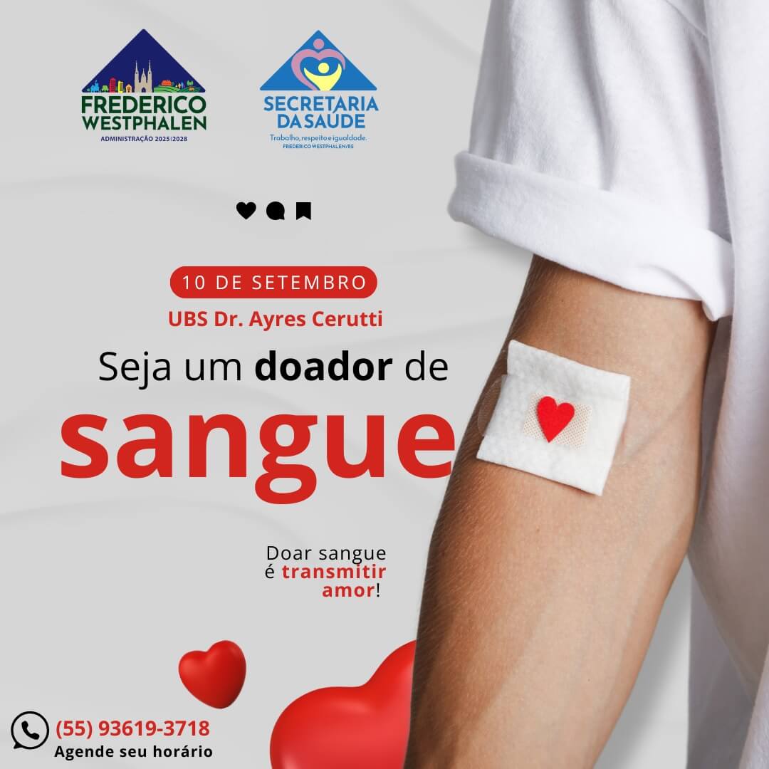 A Secretaria Municipal da Saúde de Frederico Westphalen, em parceria com os municípios da Associação dos Municípios da Zona da Produção (Amzop), convida toda a comunidade para participar de mais uma ação de Doação de Sangue, que será realizada nesta quarta-feira, 10 de setembro, no Posto Ayres Cerutti, no centro da cidade.