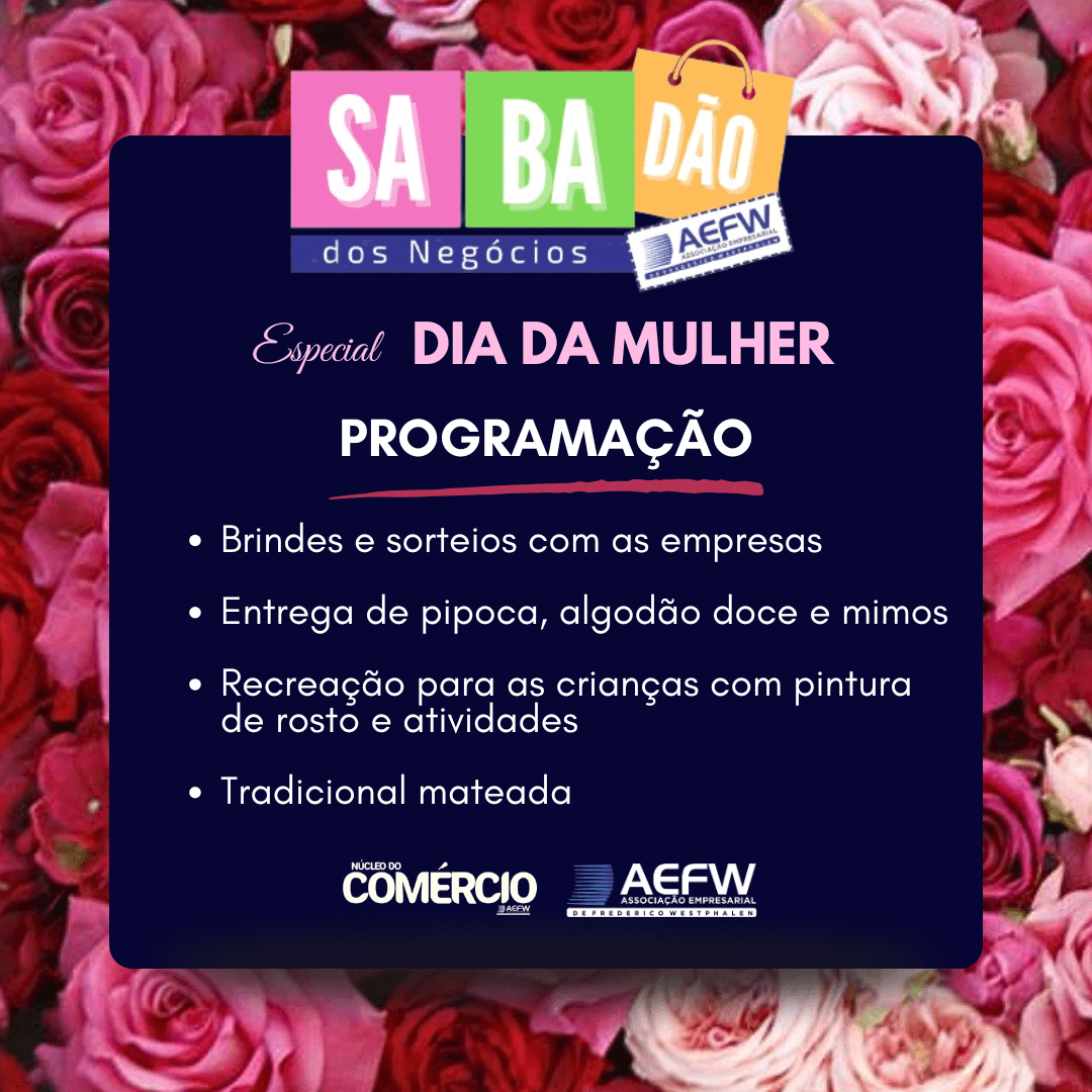 A Associação Empresarial ACI/CDL de Frederico Westphalen (AEFW), juntamente com o Núcleo de Desenvolvimento do Comércio, realiza neste sábado, 07 de março, a primeira edição de 2026 do Sabadão dos Negócios. A ação será especial em comemoração ao Dia Internacional da Mulher e promete movimentar o centro da cidade com uma programação diferenciada para quem circular por lá.