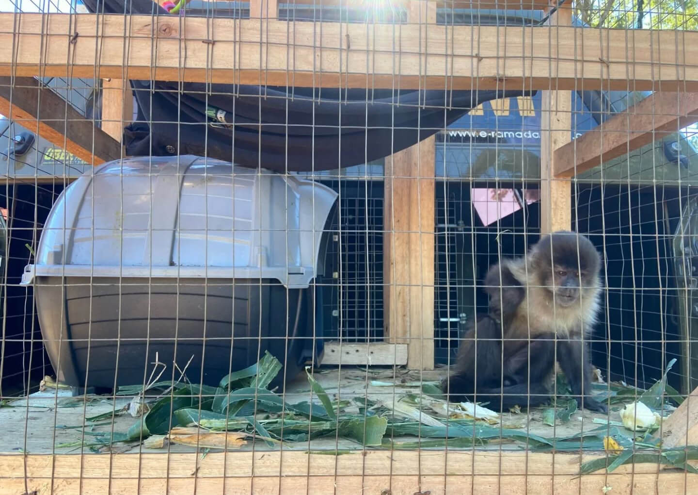 Ao chegarem ao local, os policiais militares confirmaram a presença do primata confinado em uma gaiola. O proprietário afirmou ter encontrado o animal ferido anteriormente e, desde então, o mantinha em sua residência para cuidados.