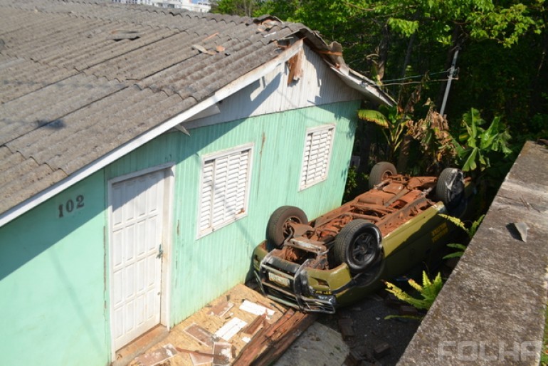 O veículo acabou quebrando parte do telhado da casa, situada abaixo do nível da rua Marechal Tito