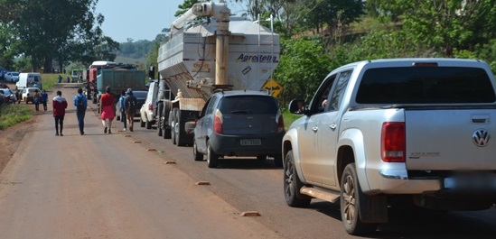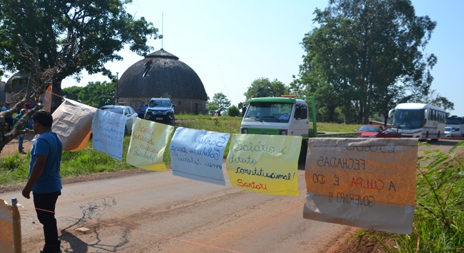 Com cartazes e faixas, professores, alunos e comunidade indígena da aldeia Pinhalzinho bloquearam a ERS 324 que liga Planalto a Nonoai nesta terça-feira (19). O protesto contra o parcelamento salarial dos servidores estaduais ocorreu no quilometro 40 da rodovia e deve seguir até o final do dia. Longas filas de veículos se formam nos dois sentidos da estrada. A liberação do trânsito ocorreu a cada hora.