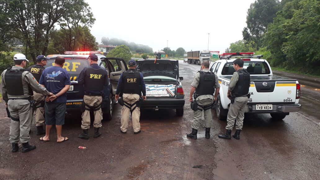 Os policiais abordaram um veículo Versailles com placas de Pelotas/RS, e ao realizarem a fiscalização da documentação do condutor, de 39 anos, descobriram que ele contava com diversas passagens, e ao visualizarem o interior do carro, perceberam que havia caixas sobre o banco traseiro. Em revista minuciosa, os policiais perceberam que o condutor levava cerca de 1150 pacotes de diversas marcas de cigarros contrabandeados – a carga possui valor estimado em R$ 57.500,00.
