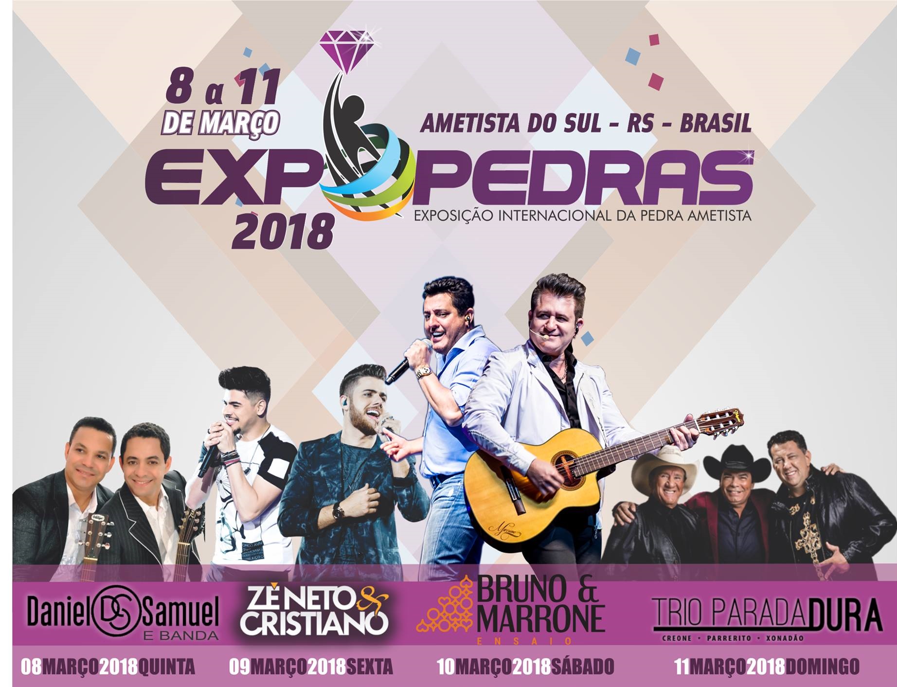 Shows nacionais estão confirmados para a Expopedras 2018, entre as atrações, a dupla Zé Neto e Cristiano, Bruno e Marrone e Trio Parada Dura. No próximo sábado, 16 de dezembro, a partir das 9h, acontece na Praça Central de Ametista do Sul, a comercialização das mesas bistrô e ingressos, da Expopedras 2018.