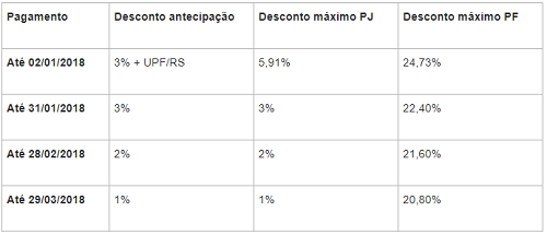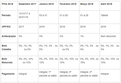 O pagamento integral antecipado do IPVA 2018 com desconto de 3%, e sem a atualização da UPF, poderá ser feito somente até 2 de janeiro de 2018. A partir dessa data, o pagamento do imposto pode ocorrer até março com descontos no parcelamento. Para tanto, o proprietário do veículo precisa pagar a primeira parcela até 31 de janeiro. As duas subsequentes serão em fevereiro, até o dia 28, e março, até o dia 29. Os descontos são de 3% para a primeira parcela, 2% para a segunda e 1% para a terceira.
