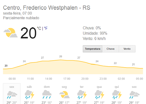 Conforme o meteorologista Fernando Lopes, a sexta-feira (22) começa com forte calor e, no sábado (23), a chuva se espalha pelo Estado. "A temperatura sobe no começo do feriadão, e o tempo esquenta bastante. Logo em seguida, uma frente fria passa pelo Estado, provocando chuvas fortes e até temporais", detalha Lopes. "Em grande parte do Estado, o sol ainda aparece e a temperatura dispara, passando dos 38º C", alerta.