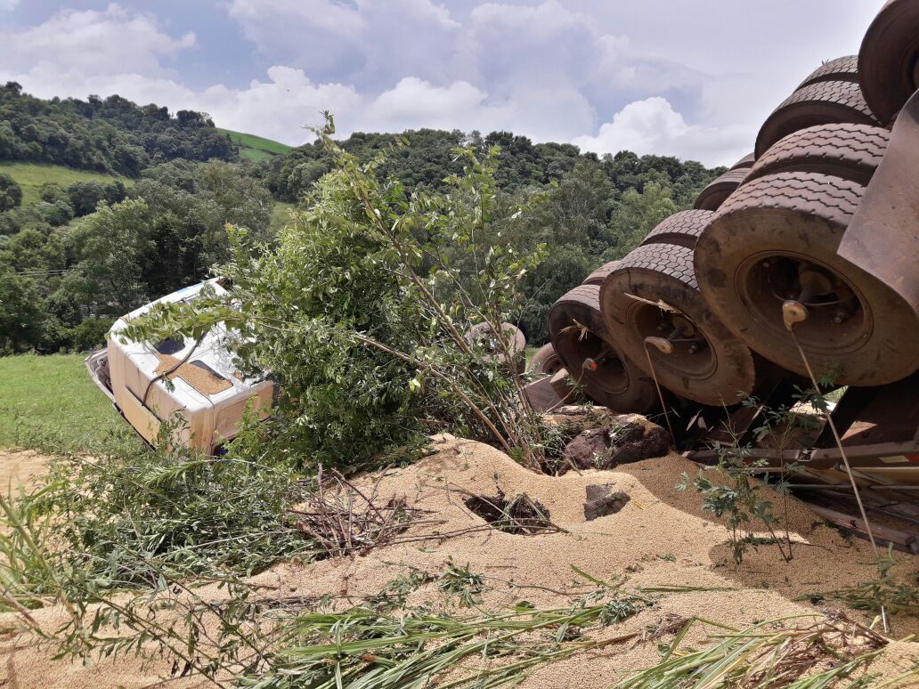 Caminhão carregado com soja capota na ERS 404 em Rondinha