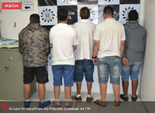 A Brigada Militar e a Polícia Rodoviária Federal prenderam cinco homens na madrugada deste domingo, 04. Eles tem menos de 30 anos de idade, são da região metropolitana e a maioria tem passagem pela polícia. Todos foram encaminhados para a Delegacia de Polícia Civil de Frederico Westphalen, onde foram ouvidos pelo delegado Ercíio Carletti. Já no início da tarde, após prestar depoimento, o grupo foi recolhido no Presídio Estadual de Frederico Westphalen.