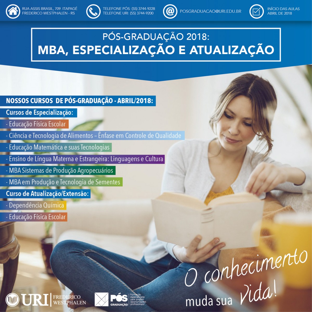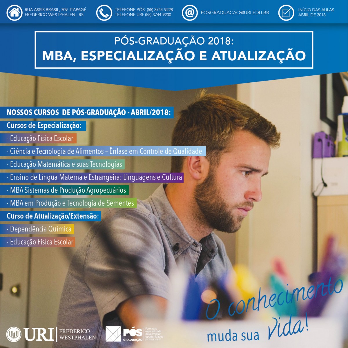 E é pensando na continuidade desse aprendizado que a Universidade oferece oito novos cursos de Pós-graduação, para o primeiro semestre de 2018. Os interessados em MBA, Especialização ou atualização não podem perder essa oportunidade.