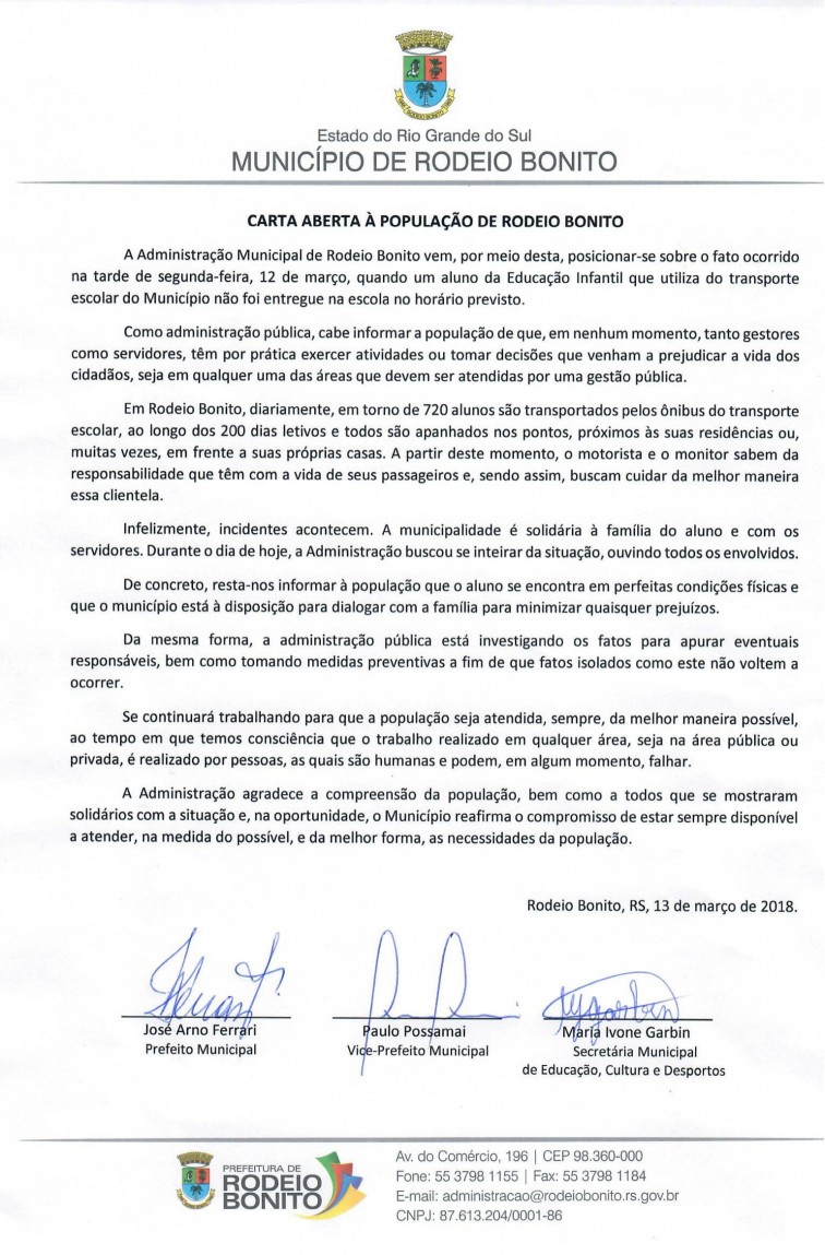 No fim da tarde desta terça-feira, 13, a Prefeitura de Rodeio Bonito divulgou em seu site uma Carta Aberta à população, na qual destaca que a Administração se dispõe a dialogar com a família a fim de minimizar qualquer prejuízo. “Da mesma forma, a administração pública está investigando os fatos para apurar eventuais responsáveis, bem como tomando medidas preventivas a fim de que fatos isolados como este não voltem a ocorrer. Se continuará trabalhando para que a população seja atendida, sempre, da melhor maneira possível, ao tempo em que temos consciência que o trabalho realizado em qualquer área, seja na área pública ou privada, é realizado por pessoas, as quais são humanas e podem, em algum momento, falhar”, diz o texto.