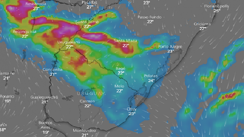 "Áreas de instabilidades que se formam há mais de 10 quilômetros de altitude, mais a frente fria, favorecem a chuva. Tem risco de temporal para todo estado, chuva muito forte, com maiores acumulados de precipitações na região da fronteira", afirma.
