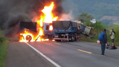 Conforme informações preliminares do Comando Rodoviário da Brigada Militar, cerca de dois caminhões e um carro pegaram fogo no local.