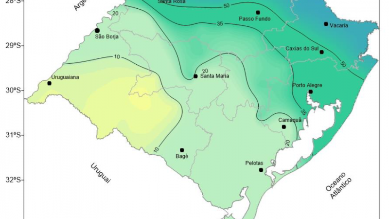 Os totais de chuva esperados para o período deverão oscilar entre 15 e 40 milímetros na maioria das localidades. No Vale do Uruguai, Planalto e na Serra do Nordeste, os totais poderão superar 60 milímetros. Na Campanha Central e na Fronteira Oeste, os volumes deverão ser inferiores a 10 milímetros.