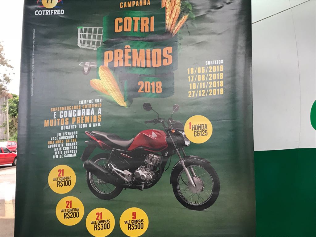 A cada R$ 50 em compras na Rede de Supermercados da Cotrifred, o consumidor recebe um cupom para concorrer a um total de 73 vale-compras (21 já sorteados nesta sexta-feira, 18). Nas agropecuárias, a cada R$ 200 em compras, o consumidor recebe um cupom para concorrer a um total de 29 prêmios. Além disso, serão sorteadas duas motocicletas zero quilômetro – Honda CG 125.
