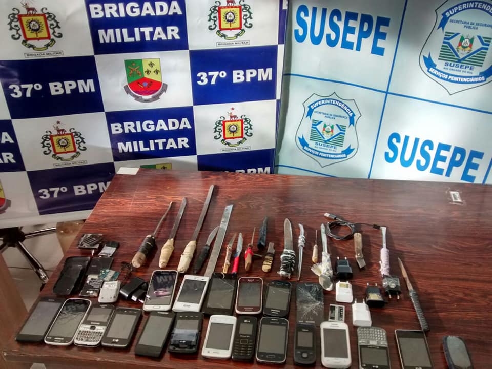 Agentes da Superintendência dos Serviços Penitenciários (Susepe) com apoio de um grande contingente da Brigada Militar realizaram na tarde desta terça-feira, 22, uma revista no Presídio Estadual de Iraí. No local foram encontrados nas celas da casa prisional 21 celulares, quatro baterias, seis carregadores e mais 16 facas.