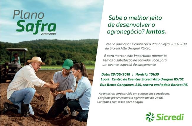 Está marcado para esta quinta-feira, dia 28, o lançamento do Plano Safra 2018/2019 da Sicredi Alto Uruguai RS/SC. O evento reunirá associados, clientes, parceiros e colaboradores em Rodeio Bonito, no centro de eventos da cooperativa de crédito, às 10h30min.