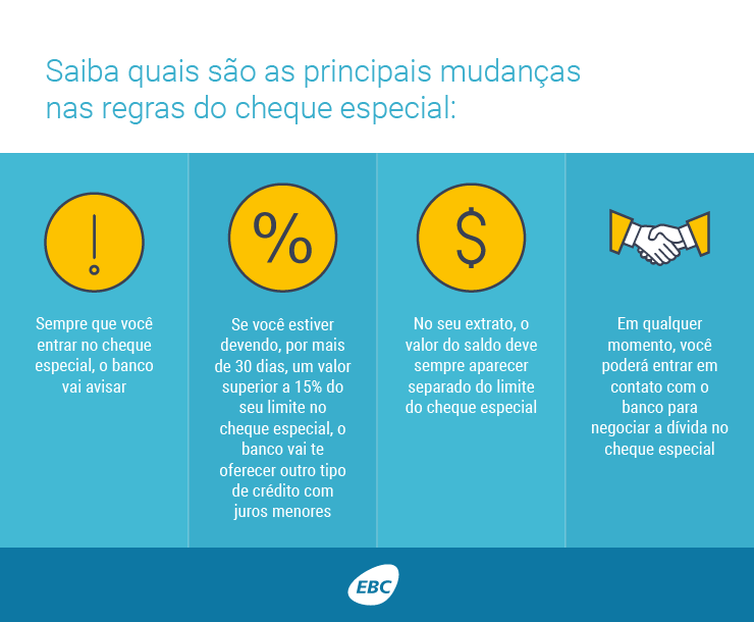 A partir deste domingo (1º), entram em vigor as novas regras para uso cheque especial. As medidas, elaboradas pelo conselho de autorregulação da Federação Brasileira de Bancos (Febraban), determinam a oferta de alternativas para o pagamento do saldo devedor com juros menores e condições mais vantajosas, além de ampliar a transparência e o detalhamento de informações sobre o uso desse tipo de crédito. O cheque especial é uma modalidade de crédito rotativo, vinculada diretamente à conta-corrente do usuário, sem necessidade de garantia.