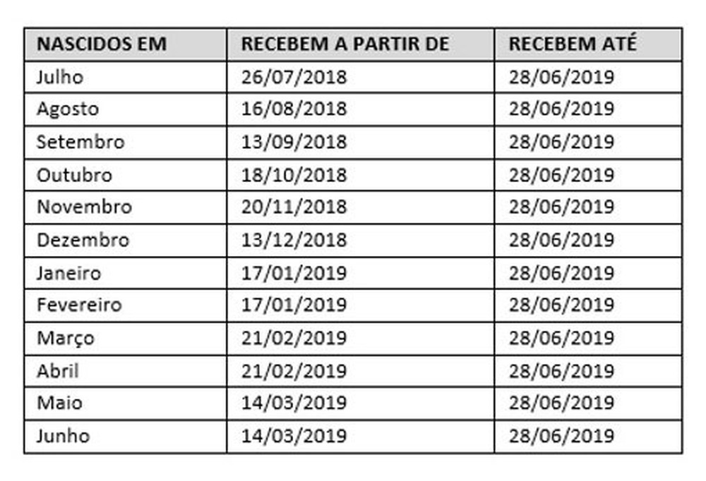 De acordo com o calendário, quem nasceu nos meses de julho a dezembro receberá o benefício ainda no ano de 2018. Já os nascidos entre janeiro e junho receberão no primeiro trimestre de 2019. Em qualquer situação, o recurso ficará à disposição do trabalhador até 28 de junho de 2019, prazo final para o recebimento. Confira aqui o calendário.
