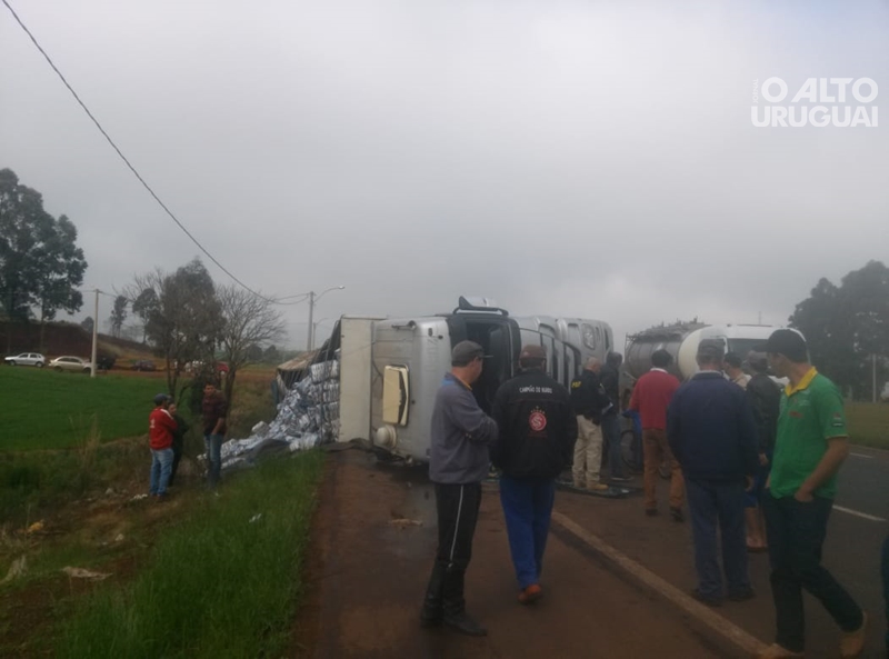 Uma carreta com placas de Cunha Porã (SC) tombou na manhã desta sexta-feira, 27, no trevo entre as BR’s 386 e 158, em Boa Vista das Missões.