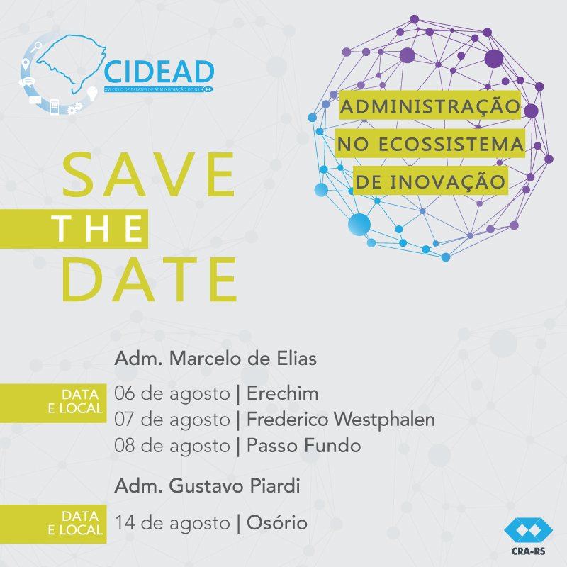 Outras cidades do Estado recebem o Ciclo no mês de agosto, são elas: Passo Fundo (08/08), Osório (14/08), Gravataí (15/08) e Santa Maria (16/08). O CIDEAD RS (Ciclo de Debates de Administração do RS) é um projeto desenvolvido pelo Conselho Regional de Administração do Rio Grande do Sul que desde o ano de 2003 leva ao interior do estado conferencistas renomados para tratar de assuntos atuais e de interesse da classe dos Administradores.