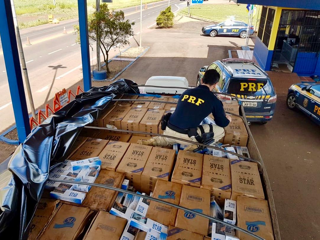 A Polcia Rodoviria Federal (PRF) e a Polcia Civil (PC) apreenderam 165mil maos de cigarro contrabandeado, carga esta oriunda do Paraguai, avaliada em R$ 800 mil. A ocorrncia foi registrada por volta das 11h desta tera-feira, 18, quando um caminho Mercedes Benz, emplacado em Santana do Livramento, foi abordado na sada de Ametista do Sul para Rodeio Bonito.