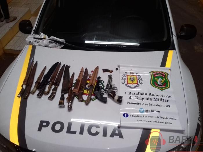 Dentro do veículo de carga foram encontrados dois revólveres e 12 facas, além de R$ 1.851. As armas e o dinheiro foram apreendidos, já o motorista do caminhão foi detido em flagrante. Sua identidade não foi divulgada.