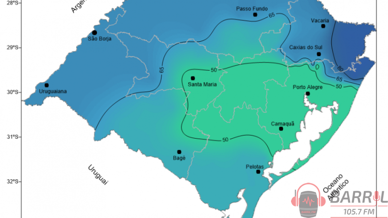 Os valores esperados deverão oscilar entre 65 e 80 milímetros (mm) nos municípios da Zona Sul, Campanha, Fronteira Oeste, Missões e Vale do Uruguai. Nos Campos de Cima da Serra, os volumes poderão superar os 90 mm. Nas demais regiões, os totais deverão variar entre 40 e 60 mm.