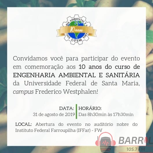Neste sábado (31 de agosto), será realizado evento comemorativo aos 10 anos do curso de Engenharia Ambiental e Sanitária da Universidade Federal de Santa Maria campus Frederico Westphalen. A atividades iniciam às 8h30 e se estendem até às 17h. O evento vai reunir alunos, egressos, professores, coordenadores e todos os que fizeram parte do desenvolvimento do curso.