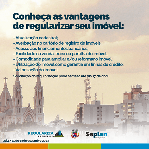 Instituído pela Lei Municipal número 4.732, de 19 de dezembro de 2019, o programa Regulariza Frederico já está em execução. O principal objetivo é realizar a regularização administrativa de edificações existentes e projetos técnicos aprovados e ainda não iniciados que estejam em desacordo com as normas urbanísticas municipais vigentes. Os interessados têm até o dia 17 de abril para aderir ao programa.