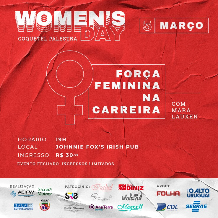 Celebrado no dia 8 de março, o Dia Internacional da Mulher é uma data muito especial, e foi pensando nisso, que a Administração Municipal, por meio da Sala do Empreendedor, em parceria com a Associação Comercial, Industrial e de Prestação de Serviço (ACI) e Sicredi Alto Uruguai RS/SC/MG, realizará um coquetel palestra ministrado pela estrategista em personal branding e carreira, Mara Lauxen, que trará o tema principal “Força feminina na carreira”.