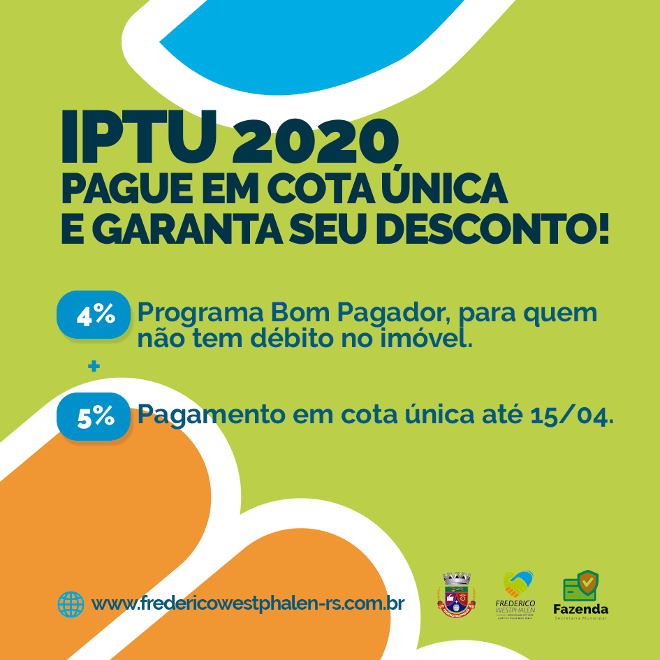 Já estão em vigor os novos prazos para os contribuintes realizarem o pagamento do Imposto Predial e Territorial Urbano (IPTU) com até 9% de desconto em Frederico Westphalen. Os proprietários cujos imóveis não tenham débitos entram no programa Bom Pagador e receberão 4% de desconto. Já os contribuintes que pagarem o IPTU em cota única até o dia 15 de abril receberão 5% de redução do valor do imposto, totalizando até 9% de desconto.