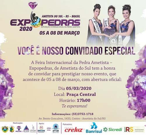 Conhecida como uma das cidades mais turísticas da região e destacada mundialmente pela sua produtividade de pedras preciosas, nessa quinta-feira, 05, terá início em Ametista do Sul a Expopedras 2020.