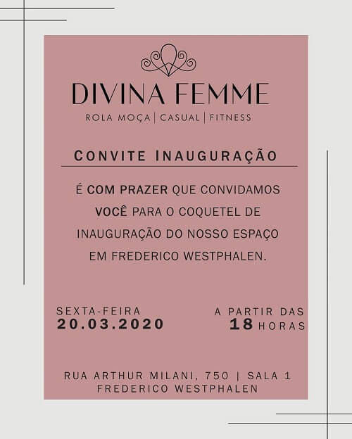 A proprietária Tatiane Filipiaki, que já atuava no ramo na Rua Assim Brasil, 200, em Rodeio bonito, trará a loja Divina Femme para Frederico Westphalen. O novo espaço tem assinatura arquitetônica de Juliana Panosso e será na Rua Arthur Milani, 750, sala 1.
