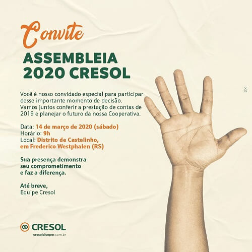 Depois da reinauguração do espaço em Caiçara e do Happy Hour, ambos realizados no dia 05 de março, a Cresol Cooperativa de Crédito promoverá no sábado, 14 a sua Assembleia Geral Ordinária, no Distrito de Castelinho para que seja possível fazer a prestação de contas.