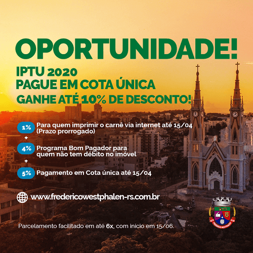 A Administração Municipal de Frederico Westphalen está mantendo a possibilidade do desconto máximo em cota única para quem fizer a impressão do boleto pela internet e pagar até esta quarta-feira, 15. Além disso, adiou o início do parcelamento do Imposto Predial e Territorial Urbano (IPTU). A medida busca facilitar o pagamento da taxa em virtude das medidas de isolamento social e suspensão do atendimento presencial no comércio.
