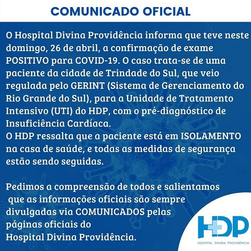 Na tarde do último domingo 27, a prefeitura municipal de Frederico Westphalen, juntamente a Secretária de Saúde se pronunciou em nota oficial sobre o caso confirmado de Covid-19 que está sendo tratado no Hospital Divina Providência (HDP).