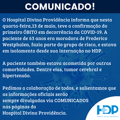 Em comunicado oficial da gestão do Hospital Divina Providência na manhã dessa quarta-feira, 13, confirmou o primeiro óbito por Covid-19. Uma paciente de 63 anos, frederiquense, passou uma cirurgia de retirada de tumor cerebral na cidade de Passo Fundo.