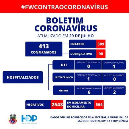 Por meio do boletim epidemiológico da quarta-feira, 29, a Prefeitura de Frederico Westphalen, somado ao Hospital Divina Providência confirmaram, mais falecimento por complicações consequentes da Covid-19. A paciente, veio a falecer na terça-feira, 28, ela era moradora de Sarandi, tinha 57 anos e estava internada no HDP. Não foi informado para imprensa se ela já sofria de comorbidades ou doenças crônicas.