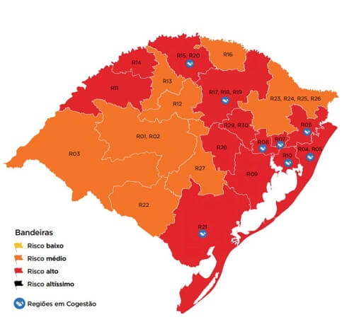 Após novo pronunciamento na tarde dessa segunda-feira, 24, o governador Eduardo Leite, reorganizou as regiões sob o modelo de distanciamento social controlado, para conter a Covid-19. Dessa vez, 10 regiões permaneceram sob bandeira vermelha: Canoas, Capão da Canoa, Novo Hamburgo, Lajeado, Palmeira das Missões, Passo Fundo, Porto Alegre, Pelotas, Santa Cruz do Sul, Santa Rosa e Taquara.