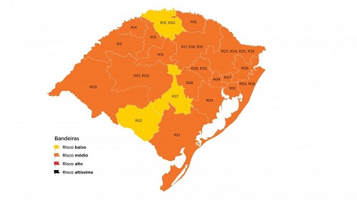 Das 21 regiões Covid, apenas Uruguaiana, Bagé e Guaíba não aderiram ao sistema compartilhado. As outras 18 já adotam protocolos alternativos às bandeiras definidas pelo governo – Cachoeira do Sul, Canoas, Capão da Canoa, Caxias do Sul, Cruz Alta, Erechim, Ijuí, Lajeado, Novo Hamburgo, Palmeira das Missões, Passo Fundo, Pelotas, Porto Alegre, Santa Cruz do Sul, Santa Maria, Santa Rosa, Santo Ângelo e Taquara