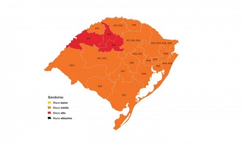 Presentes também duas rodadas atrás, as bandeiras amarelas (risco epidemiológico baixo) nas regiões de Bagé, Cachoeira do Sul e Palmeira das Missões deram lugar, novamente a bandeiras laranjas (risco médio). As outras 15 regiões também ficaram com a cor laranja.
