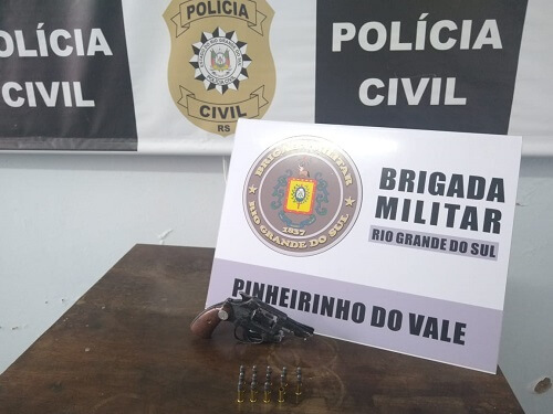 Na residência do suspeito foi apreendido um revólver calibre 22 e munições de mesmo calibre. O investigado responderá pelo crime de posse ilegal de arma de fogo.