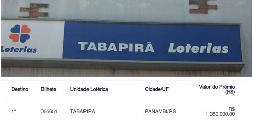 Em sorteio realizado em São Paulo pelo Concurso 5516 neste sábado, 21, no espaço das Loterias, em um prêmio de R$1,35 milhão, a sorte alcançou a cidade de Panambi, em aposta realizada na Lotérica Tabapirã localizada na Rua Alfredo Brenner, centro da cidade. Segundo informações do representante da agência lotérica, as cartelas da extração federal com 10 bilhetes todas com a mesma numeração foram sorteadas. Agora o sortudo panambiense que ficou milionário, deverá buscar seu prêmio mediante apresentação das cartelas e documentação de identidade junto a agência Lotérica ou Caixa Econômica Federal da cidade.