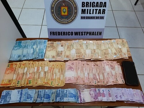 Policiais militares do 37º Batalhão de Polícia Militar (37ºBPM) apreenderam na manhã desta segunda-feira, 29, a quantia de R$ 8.920,00 (oito mil novecentos e vinte reais) em espécie e um celular Motorola em Frederico Westphalen.