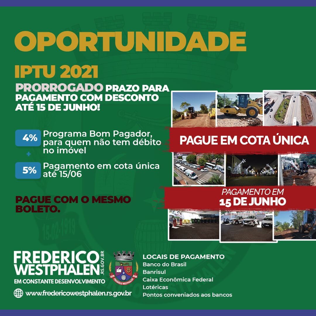A Administração Municipal de Frederico Westphalen anunciou na última semana a prorrogação da data para pagamento do Imposto Predial e Territorial Urbano (IPTU) 2021. Agora, o tributo pode ser pago até o dia 15 de junho e os contribuintes podem efetuar o pagamento com o mesmo boleto.