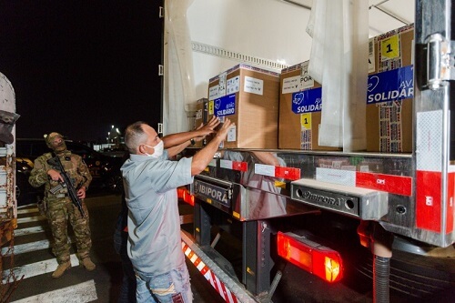 A logística do governo do Rio Grande do Sul garante uma distribuição rápida das vacinas. Leva cerca de 24 horas a distribuição das remessas, desde o pouso em Porto Alegre, até se encontrarem nas 18 CRSs e, depois, chegar aos 497 municípios gaúchos.